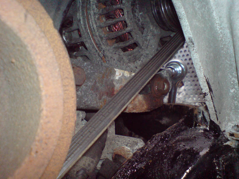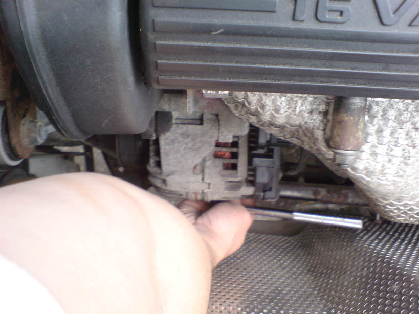 | Undo the bolt to the left of the alternator.